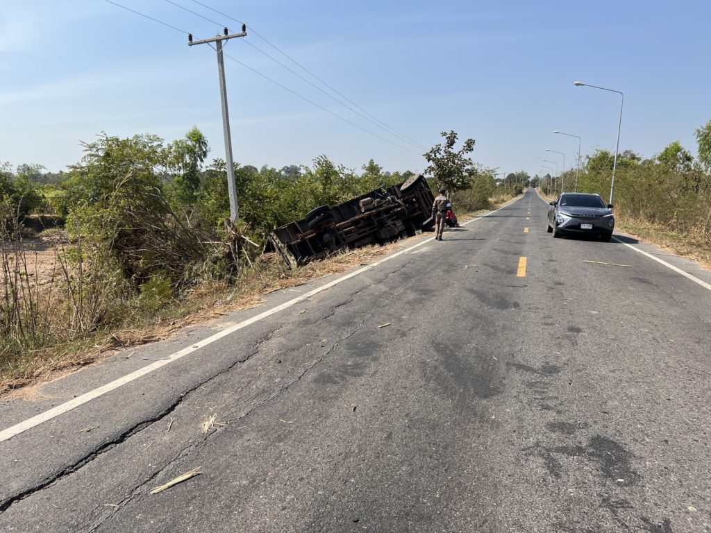 ร้อยเวร60/สายตรวจจราจร ว.4 รับแจ้งจากศูนย์วิทยุ สภ.น้ำปลีก มีเหตุรถบรรทุกอ้อยพลิกคว่ำ ถนนระหว่างบ้านแก้งกฐิน-บ้านภูจำปา ต.นาหมอม้า จว.อำนาจเจริญ ตรวจสอบพบรถบรรทุกอ้อย 6 ล้อ พลิกคว่ำบริเวณข้างถนนบ้านแก้งกฐิน-บ้านภูจำปา สาเหตุเกิดจากรถบรรทุกยางแตกทำให้เสียหลักพลิกคว่ำลงข้างทาง ไม่มีผู้ได้รับบาดเจ็บ